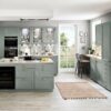 Eine Besonderheit dieser Küche sind die teils grifflosen und teils mit Griffen ausgestatteten Schranktüren, Diese unterstreichen den modernen Charakter und bieten eine klare Linienführung. Die Küche ist mit einer Kochinsel konzipiert und bietet einen großen, stauraumoptimierten Hochschrank und eine geräumige Kommode. Die schwarze Arbeitsplatte fügt sich passgenau zu den Unterschränken, Glasoberschränke und in das Gesamtbild der Küche ein. Die supermatte Oberfläche der Fronten ist besonders unempfindlich gegen Fingerabdrücke, erleichtert die Reinigung und sieht obendrein noch super aus.